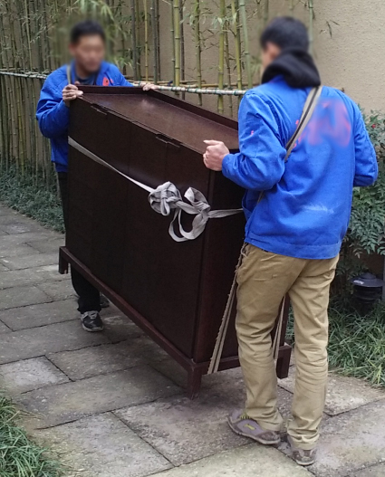 如果鋼琴要搬上樓,搬運人員一般是兩個人(一上一下),自己搬運最好要有四至五個人。首先要保證搬琴人的安全,同時鋼琴不能碰撞、劃蹭,外表的保護重于內部。鋼琴的背面朝墻壁,鍵盤朝樓梯的扶手。兩人在下,三人在上,用寬布帶挎在肩上兜住鋼琴的車腳。同時用手抓住琴背的把手和鍵盤底下(不能拉鋼琴的腿),抬起鋼琴一鼓作氣搬上一層樓再休息。特別要注意的是,鍵盤的一側不能碰扶手,車腳不能碰樓梯。到一層樓面拐彎時要當心碰撞、調整好方向然后再抬起往上搬。進房門時,也要當心蹭著門框,保證安全地把鋼琴放到安排好的位置上。